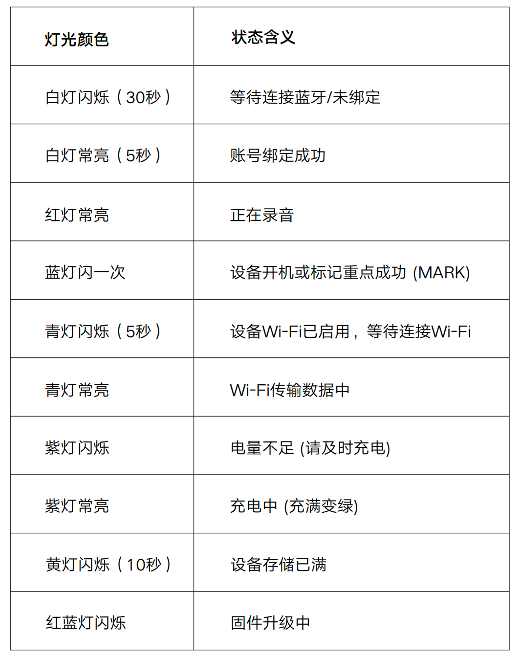 - 短按 Mark 键 7 次(相隔不超 过 0.5 秒),亮红灯 1 秒,设备关机