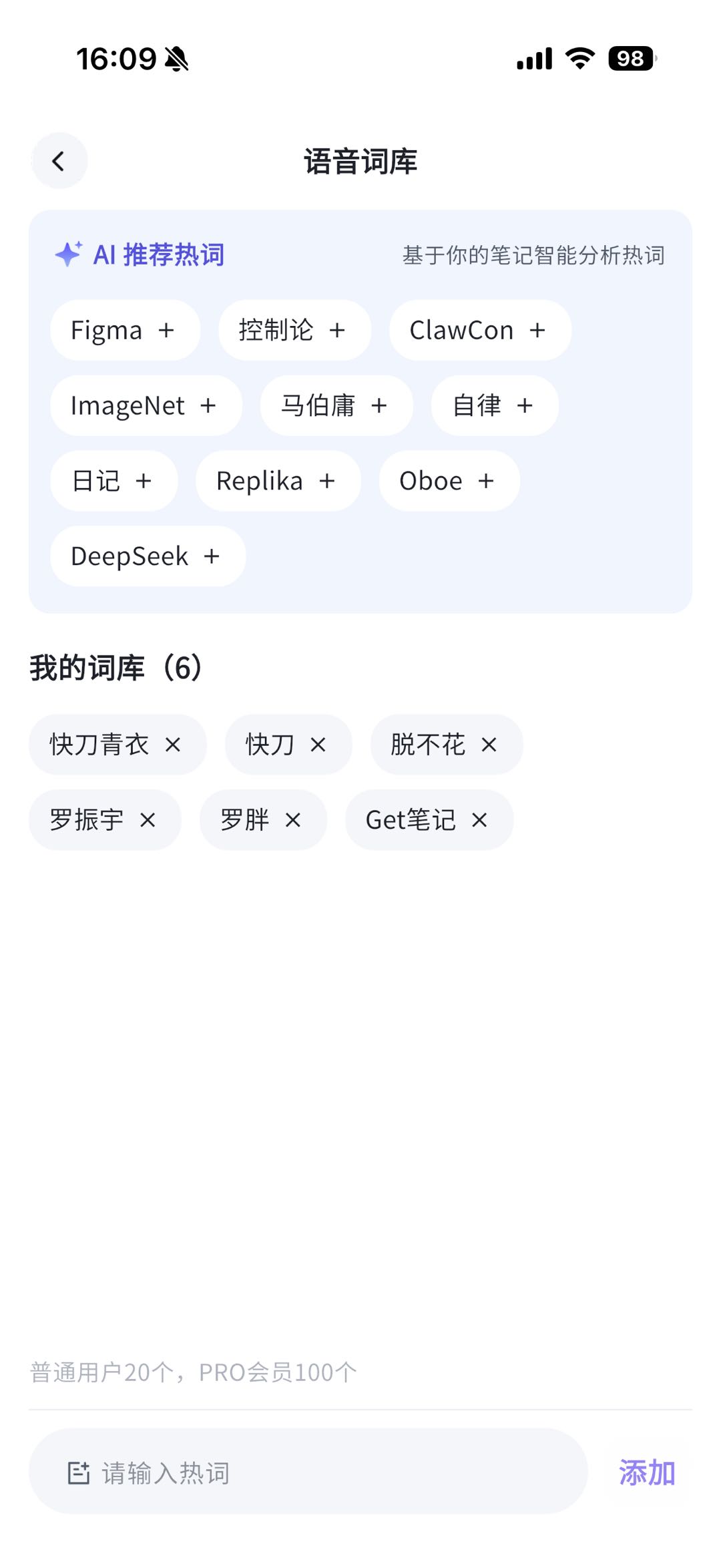 - 智能推荐热词:AI 基于你已有的笔记内容,自动分析并推荐高频出现但可能识别不准的词汇,一键添加即可
