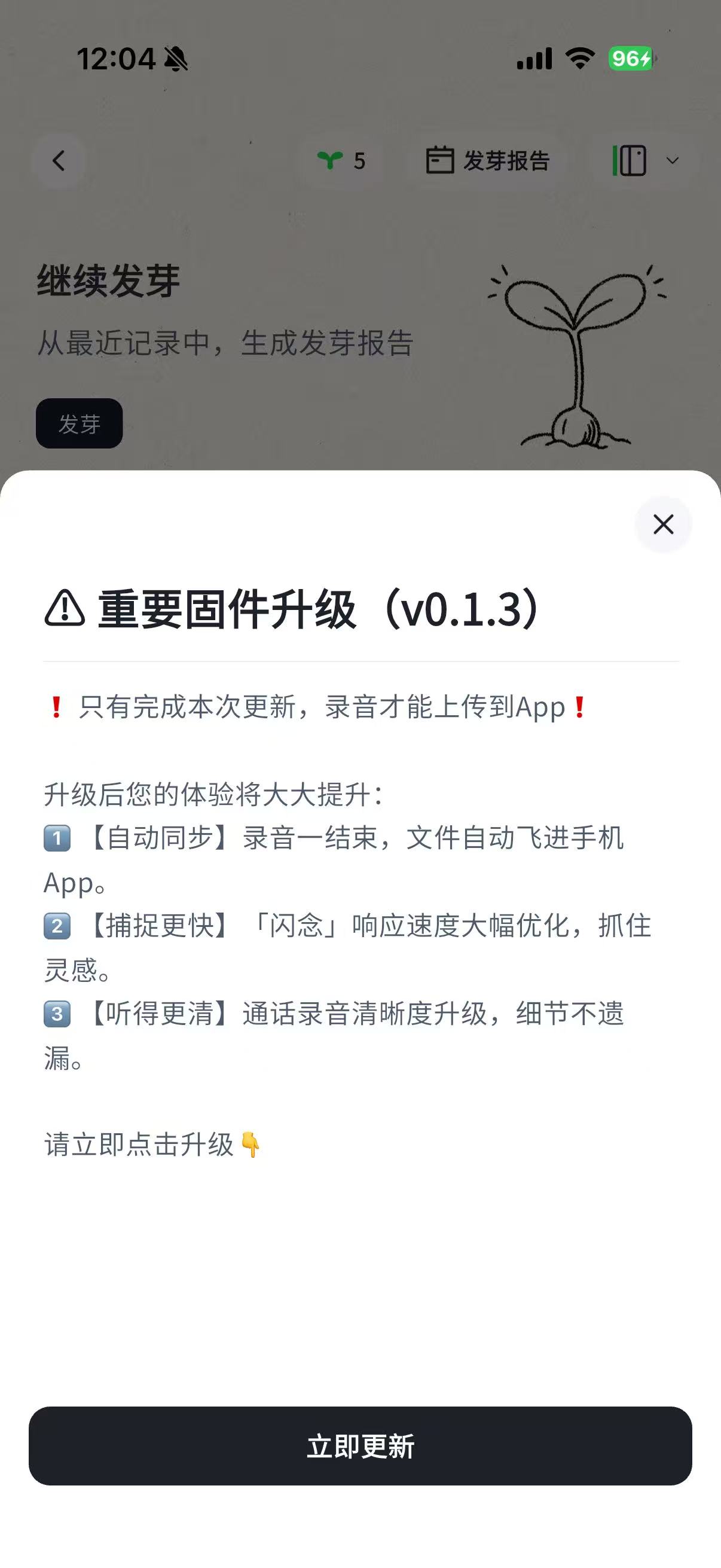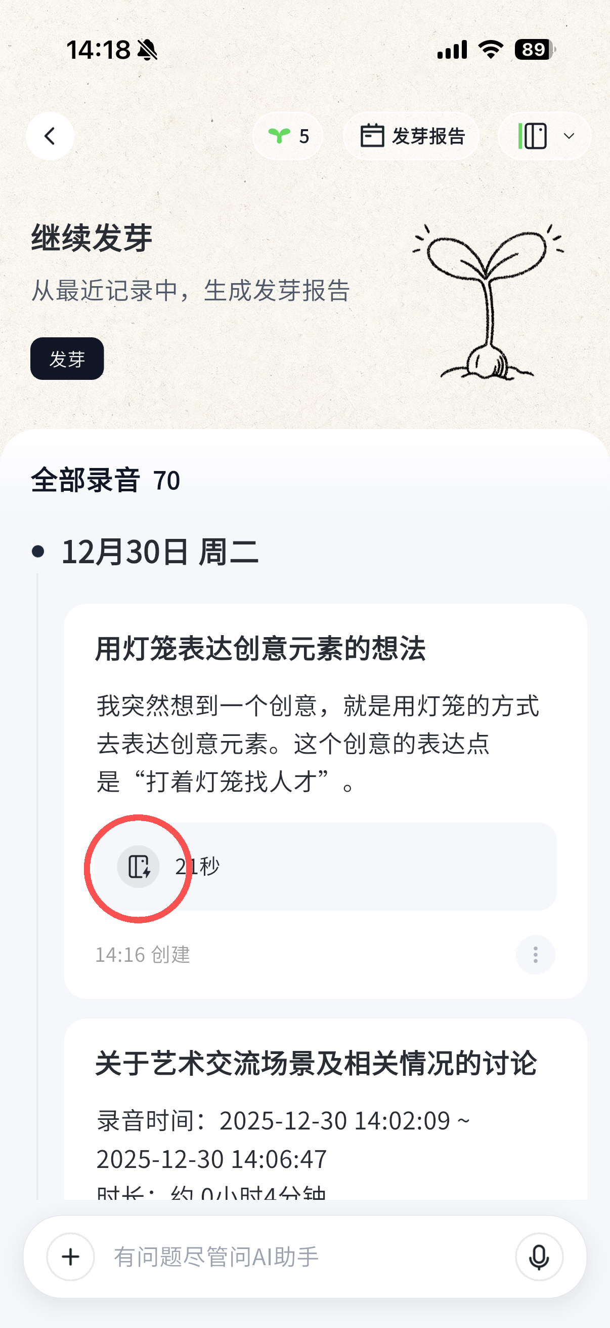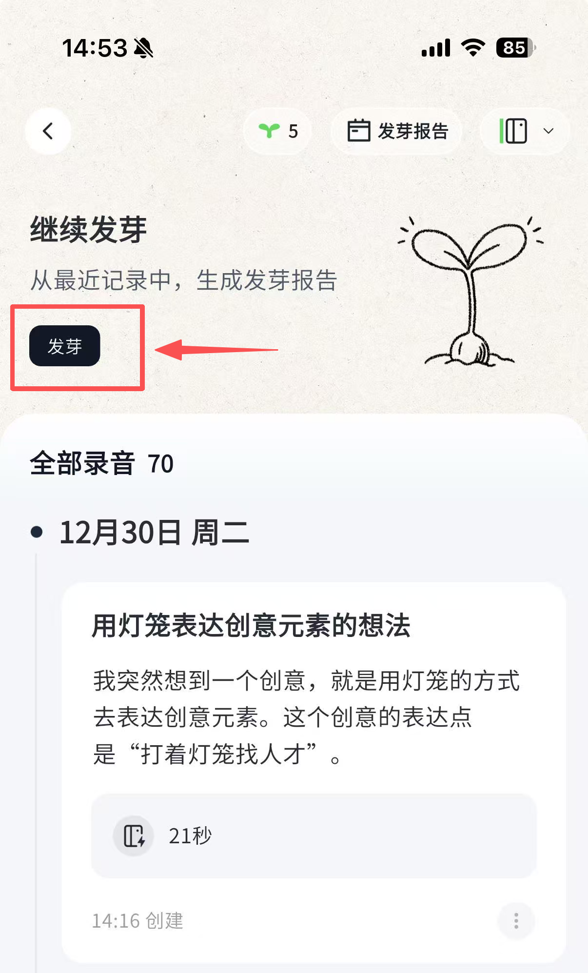 - 录音卡详情页顶部会展示发芽区域,点击「发芽」按钮,可以生成发芽报告