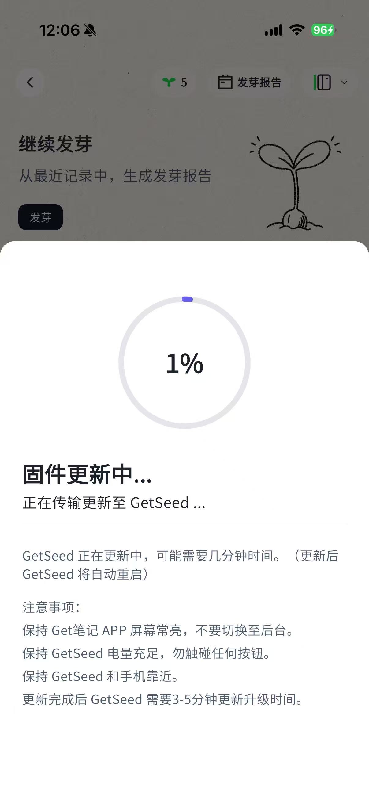 - 发芽过程预计要 3-5 分钟,可以不必等待,发芽完会有 push 通知
