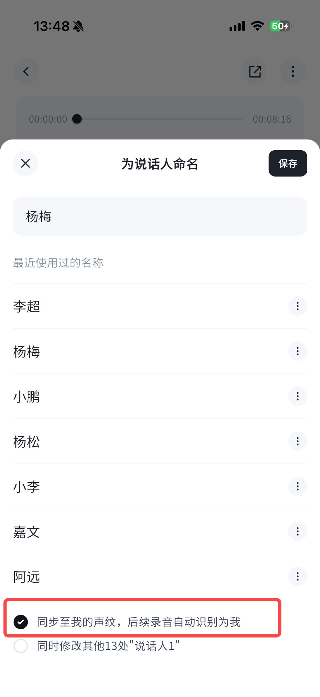 - 同时,也支持在已有录音笔记中,点「文字记录」tab,点击某个说话人并勾选“同步至我的声纹”,也可以把对应的声音标记为我自己的声音(仅限没有录入我的声音的情况下)