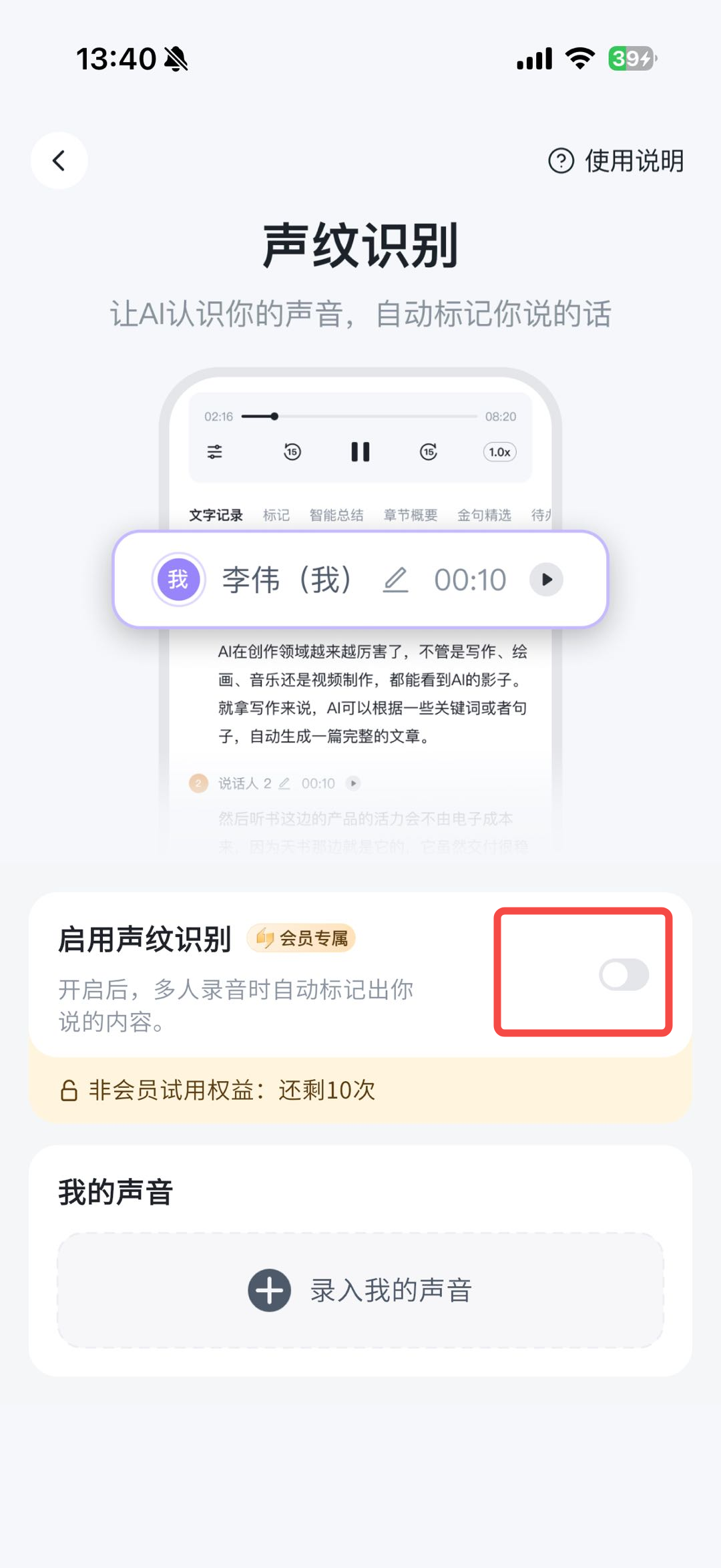- 免费用户:可免费试用 10 次(即 10 条录音笔记可进行声纹识别)